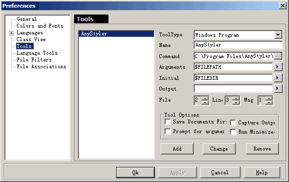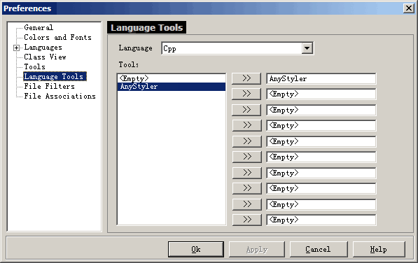 2. In the "Language" box select "Cpp", then in the "Tool" box select "FormatCode" and click ">>" button to assign FormatCode to C/C++ language.