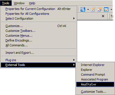 1. Click "Tools" -> "External Tools" -> "Customize Tools...".