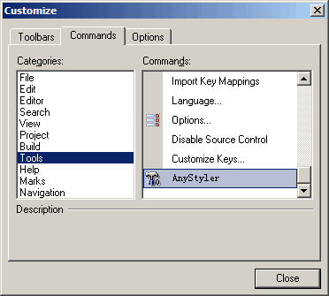 6. Select "Command" page, in the "Categories" box select "Tools", then in the "Commands" box scroll to the "FormatCode", then drag this item to toolbar to create a new tool button.