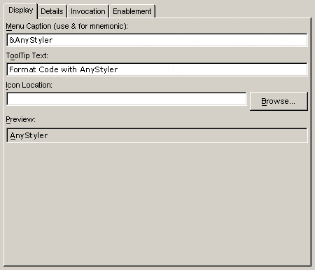 2. Set the "Menu Caption" to "&FormatCode" as follows. Optionally set the the icon location to C:\Program Files\FormatCode\FormatCode.gif.