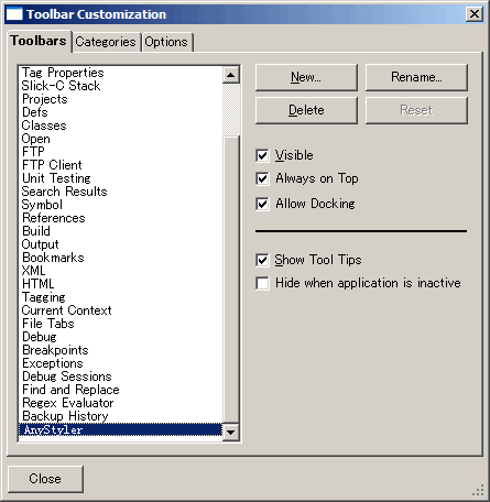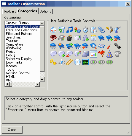 3. Select the "Categories" page, then click "User Definable Tool" item, choose an icon and drag it to the new tool bar to create a new tool button.